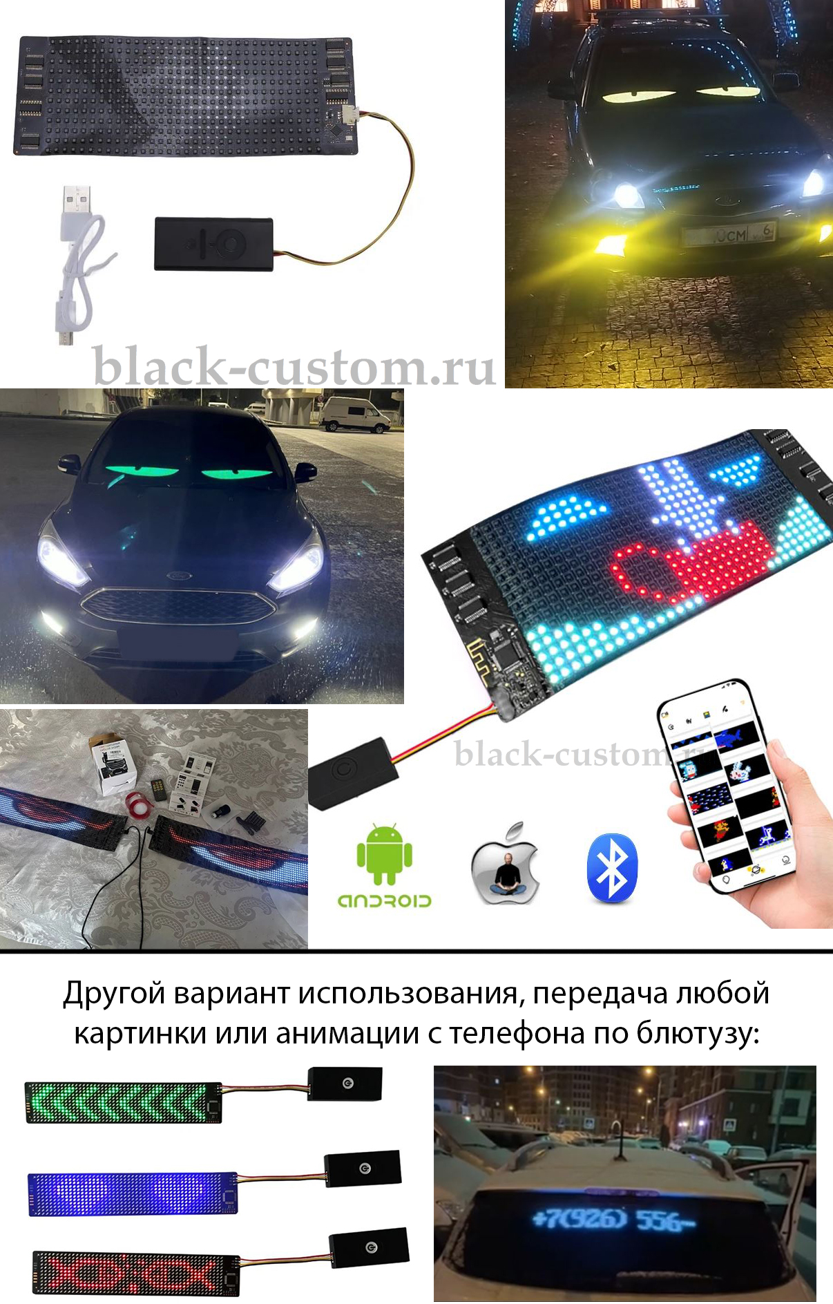 Глаза на лобовое стекло - законный тюнинг вашего автомобиля. Размер: 120 * 480, материал покрытия крепления к стеклу: силикон. LED подсветка подключается к телефону по блютузу, где в приложении вы можете писать русские надписи, вводить текст, фразы, которые будут светиться на окне бегущей строкой. Также на мини экране можно включать стикеры, цифры, смайлики, гифки из библиотеки анимаций и популярные эмодзи. Есть несколько режимов, таких как глаза, дополнительный стоп сигнал, дорожные знаки и поворотники, а также жесты, сердечки и ангельские глазки. LED модуль оснащен надежной системой крепления, что обеспечивает легкость установки и снятия без повреждения поверхности стекла.